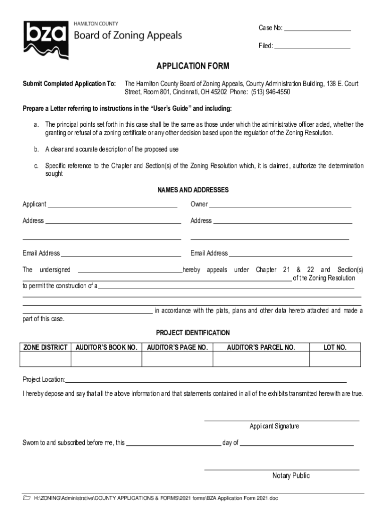 Case No: Filed: APPLICATION FORM Submit Completed Application To:The Hamilton County Board of Zoning Appeals, County Administration Building, 138 E. Court Street, Room 801, Cincinnati, OH 45202 Phone: