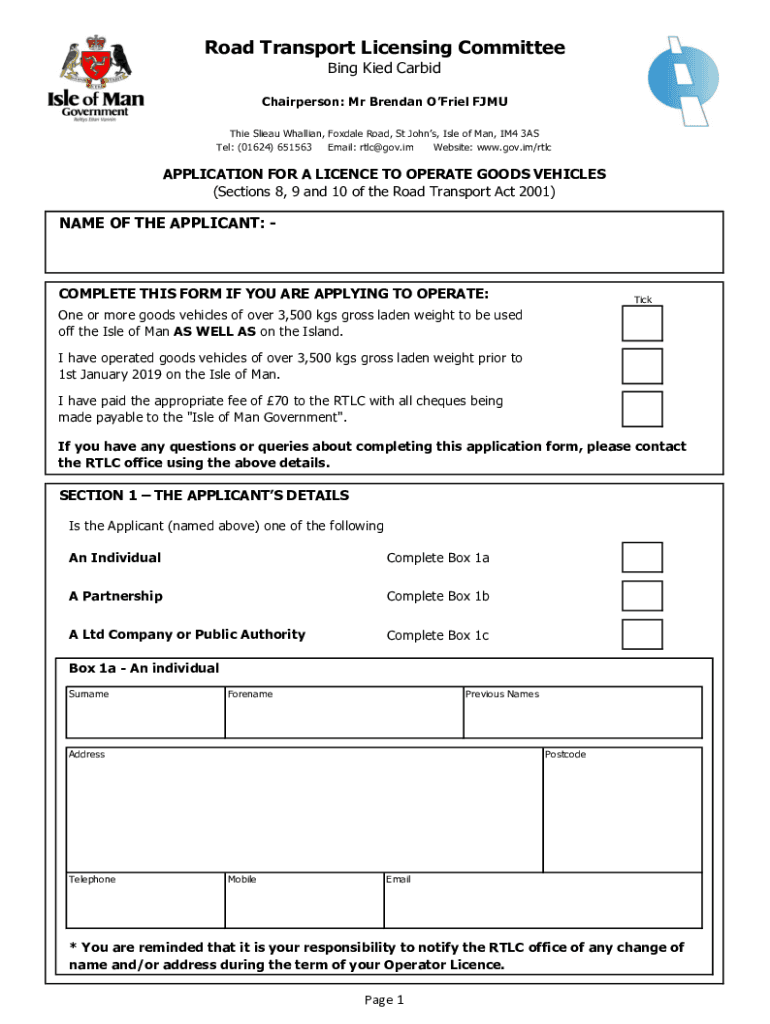 Road Transport Licensing Committee Bing Died Carbide Chairperson: Mr Brendan Oriel FIMU Thai Lieu Italian, Fox dale Road, St Johns, Isle of Man, IM4 3AS Tel: (01624) 651563 Email: rtlc@gov.im Website: