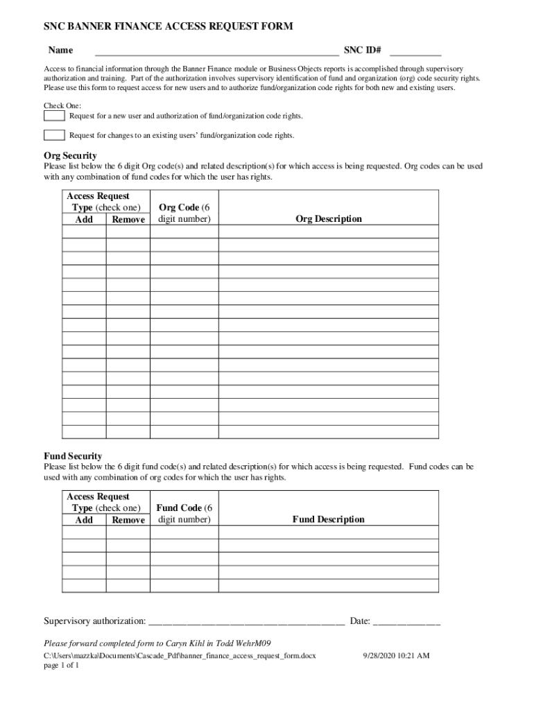 SNC BANNER FINANCE ACCESS REQUEST FORM Name SNC ID#Access to financial information through the Banner Finance module or Business Objects reports is accomplished through supervisory authorization and