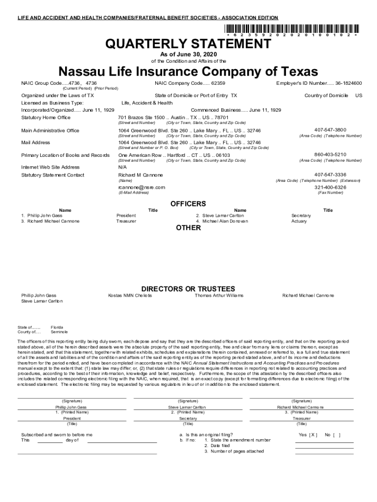 LIFE AND ACCIDENT AND HEALTH COMPANIES/FRATERNAL BENEFIT SOCIETIES ASSOCIATION EDITION×62359202020100102×QUARTERLY STATEMENT As of June 30, 2020, of the Condition and Affairs of the Nassau Life