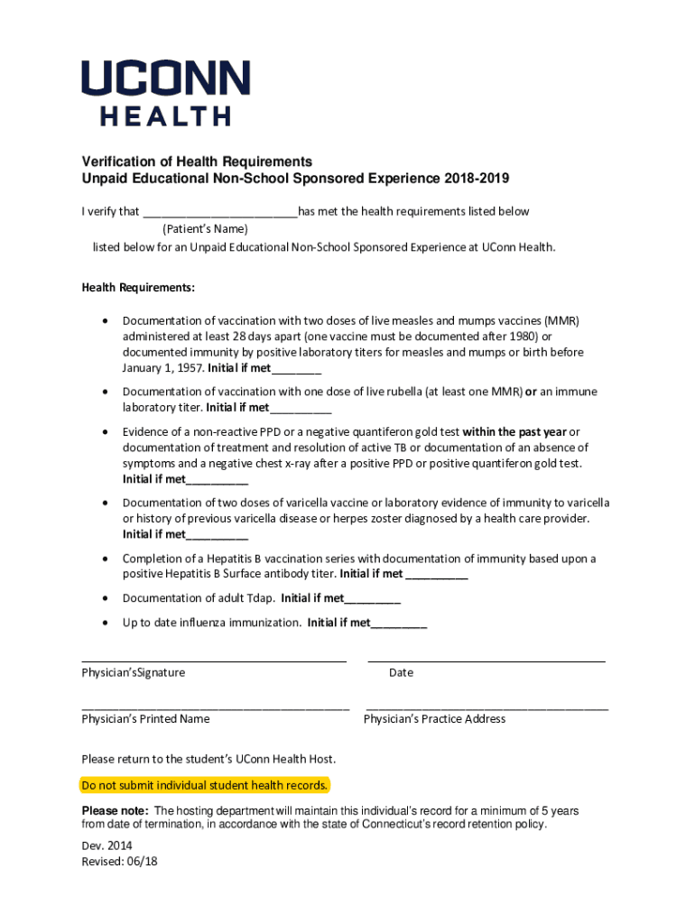 Verification of Health Requirements Unpaid Educational School Sponsored Experience 20182019Iverifythat hasmetthehealthrequirementslisted below (PatientsName) listedbelowforanUnpaidEducationalNonSchoolSponsoredExperienceatUConnHealth.