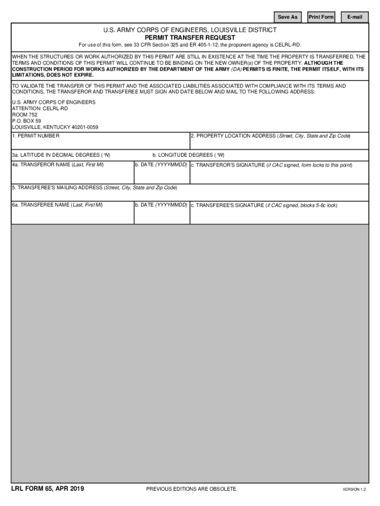 Save Sprint Foresail. S. ARMY CORPS OF ENGINEERS, LOUISVILLE DISTRICT PERMIT TRANSFER REQUEST For use of this form, see 33 CFR Section 325 and ER 405112; the proponent agency is CELLED. WHEN THE STRUCTURES