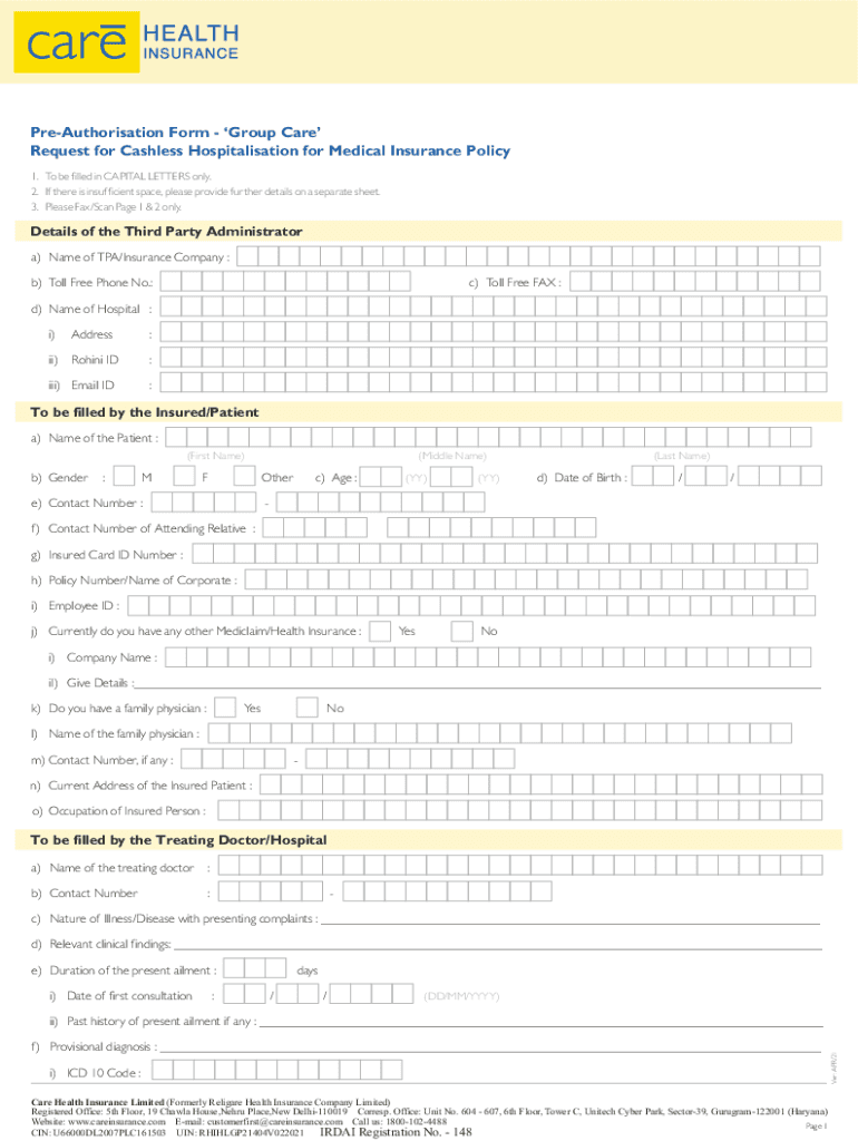 Preauthorization Form Group Care Request for Cashless Hospitalization for Medical Insurance Policy 1. To be filled in CAPITAL LETTERS only. 2. If there is insufficient space, please provide further