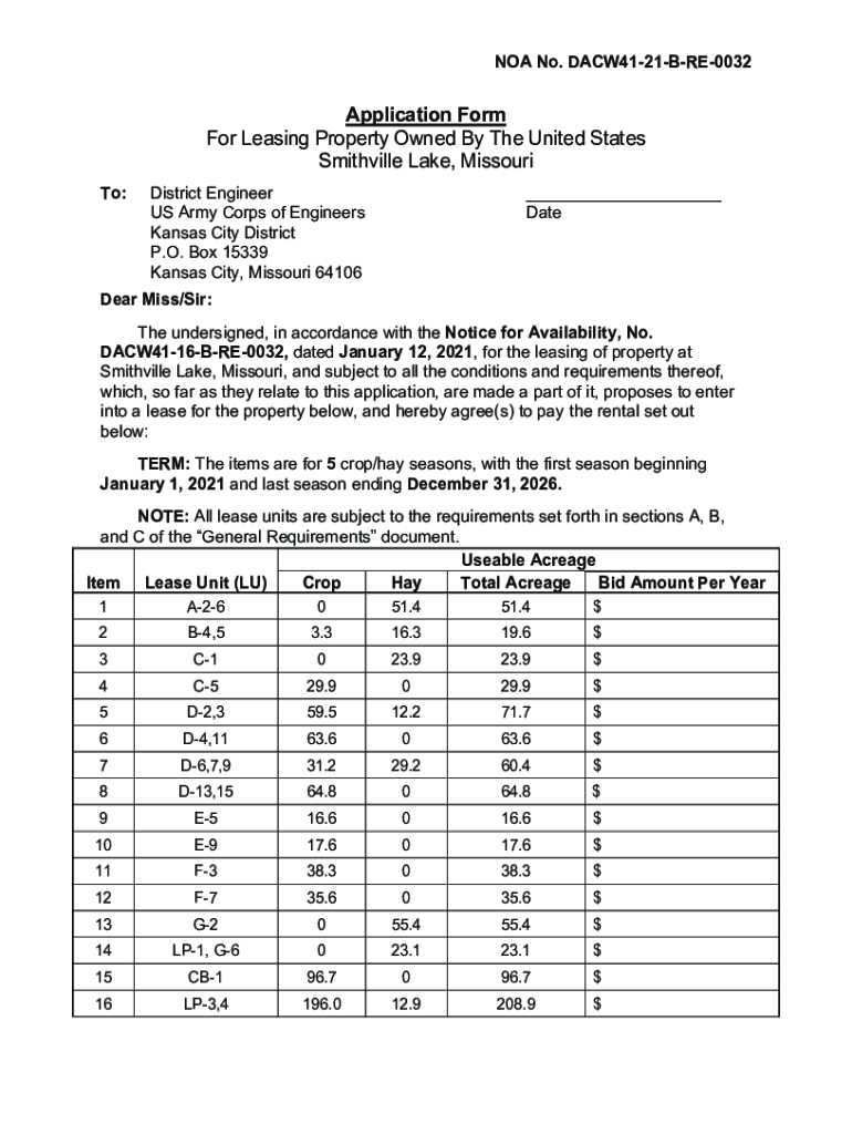 NOTICE OF AVAILABILITY TO LEASE GOVERNMENT PROPERTY Notice No. DACW4121BRE032Dated: January 12, 2021Located at SMITHVILLE LAKE, MISSOURI For Hay and Crop Purposes Only BID OPENING WILL BE CONDUCTED