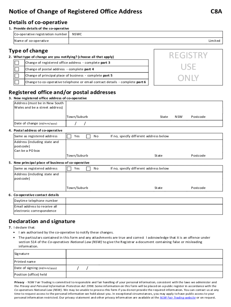 ABN 81 913 830 179Form C8A Notice of Change of Registered Office Address Cooperatives National Law (NSW) Section 226Aug 2019Application fee: NIL Late fees may be payable Web: www.fairtrading.nsw.gov.au/associationsandcooperatives/cooperatives