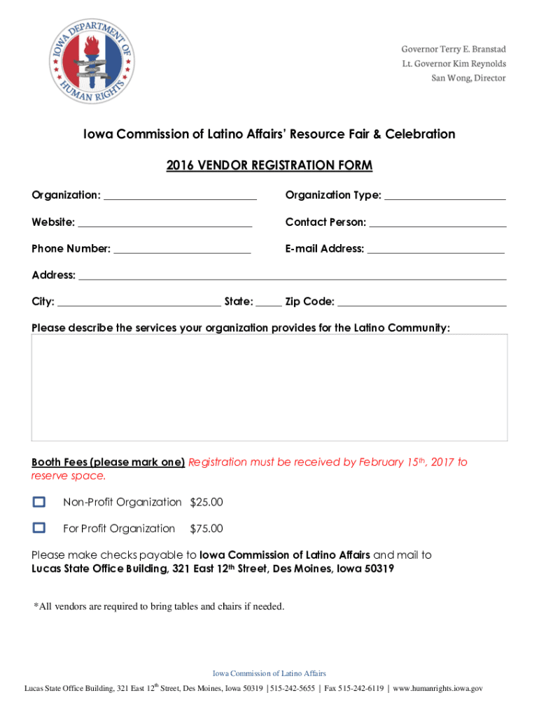Iowa Commission of Latino Affairs Resource Fair & Celebration 2016 VENDOR REGISTRATION FORM Organization: Organization Type: Website: Contact Person: Phone Number: Email Address: Address: City: State: