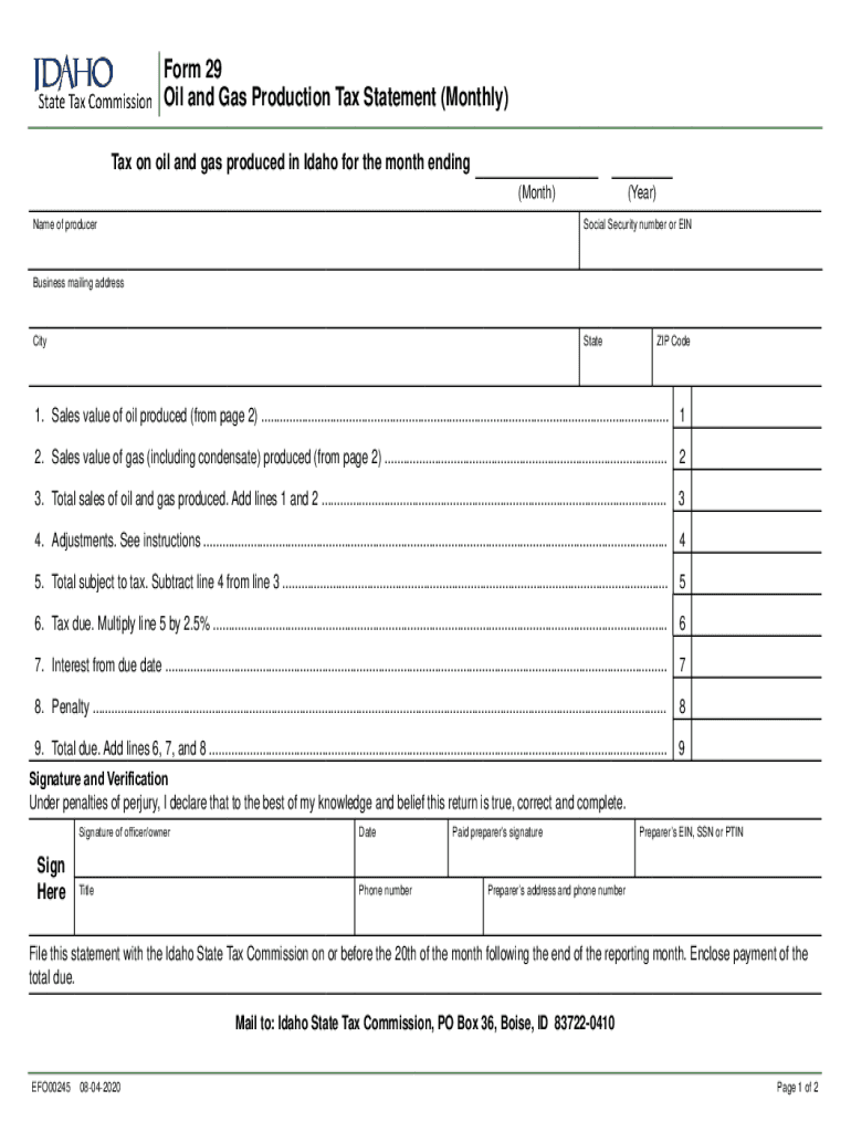 Form 29 Oil and Gas Production Tax Statement (Monthly) Tax on oil and gas produced in Idaho for the month ending (Month) Name of producer(Year) Social Security number or Business mailing addressCityStateZIP