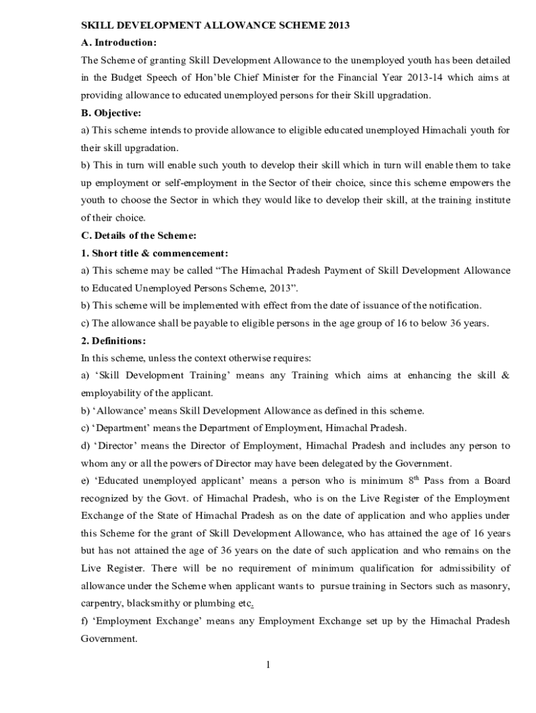 SKILL DEVELOPMENT ALLOWANCE SCHEME 2013 A. Introduction: The Scheme of granting Skill Development Allowance to the unemployed youth has been detailed in the Budget Speech of Hobble Chief Minister
