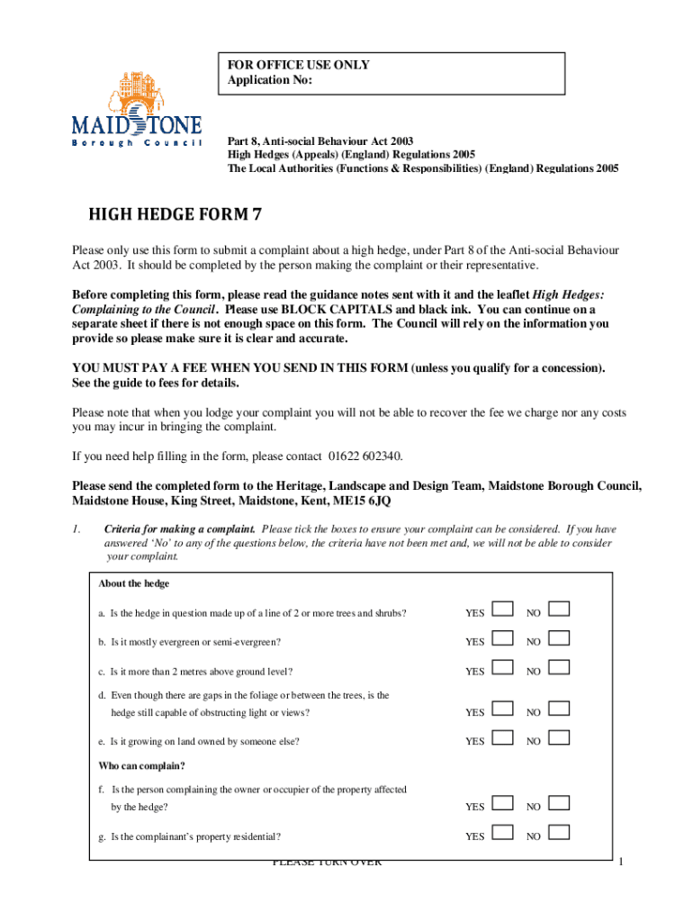 FOR OFFICE USE ONLY Application No:Part 8, Antisocial Behavior Act 2003 High Hedges (Appeals) (England) Regulations 2005 The Local Authorities (Functions & Responsibilities) (England) Regulations