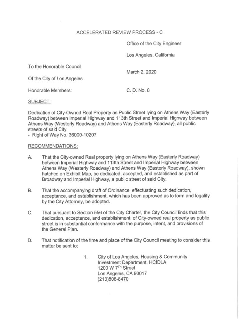 ACCELERATED REVIEW PROCESS C Office of the City Engineer Los Angeles, California To the Honorable Council March 2, 2020, Of the City of Los Angeles C. D. No. 8Honorable Members: SUBJECT:Dedication