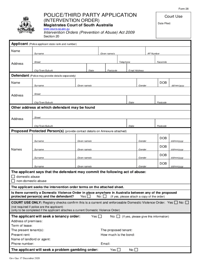 Form 28POLICE/THIRD PARTY APPLICATIONCourt Use(INTERVENTION ORDER)Date Filed:Magistrates Court of South Australia www.courts.sa.gov.auIntervention Orders (Prevention of Abuse) Act 2009 Section 20Applicant
