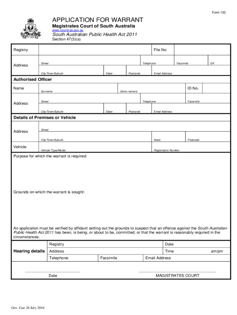 Form 132APPLICATION FOR WARRANT Magistrates Court of South Australia www.courts.sa.gov.auSouth Australian Public Health Act 2011, Section 47(3)(a) RegistryAddressFile NoStreetTelephoneCity/Town/SuburbStatePostcodeFacsimileDXEmail