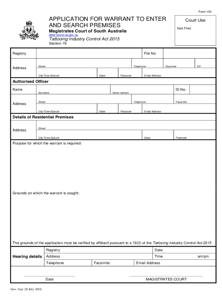 Form 134APPLICATION FOR WARRANT TO ENTER AND SEARCH PREMISESCourt Use Date Filed:Magistrates Court of South Australia www.courts.sa.gov.auTattooing Industry Control Act 2015, Section 19 RegistryAddressFile