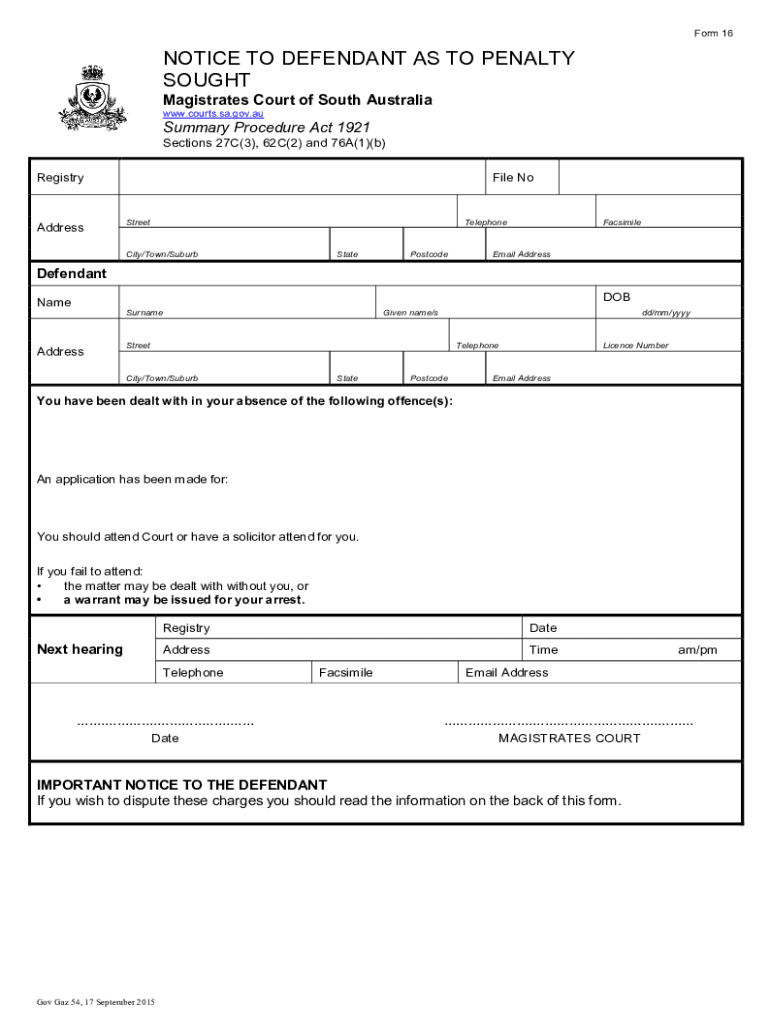 Form 16NOTICE TO DEFENDANT AS TO PENALTY SOUGHT Magistrates Court of South Australia www.courts.sa.gov.auSummary Procedure Act 1921 Sections 27C(3), 62C(2) and 76A(1)(b) RegistryAddressFile NoStreetTelephoneCity/Town/SuburbStatePostcodeFacsimileEmail