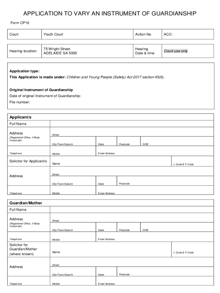 APPLICATION TO VARY AN INSTRUMENT OF GUARDIANSHIP Form CP10 Courthouse Contraction NoACCHearing location:75 Wright Street ADELAIDE SA 5000Hearing Date & timeout use onlyApplication type: This Application