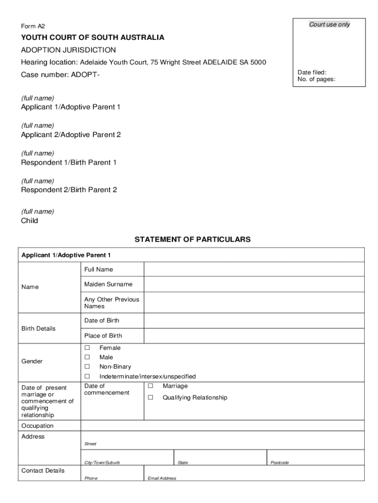 Court use uniform A2YOUTH COURT OF SOUTH AUSTRALIA ADOPTION JURISDICTION Hearing location: Adelaide Youth Court, 75 Wright Street ADELAIDE SA 5000 Date filed: No. of pages:Case number: ADOPT(full