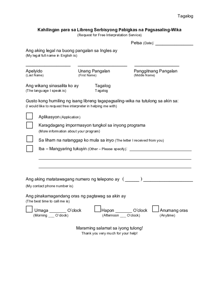 Tagalog Kahilingan para SA Living Serbisyong Parkas Na PagsasalingWika (Request for Free Interpretation Service)Pets (Date): Ang making legal Na bong Angolan SA Singles a (My legal full name in English