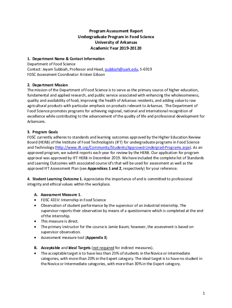 Program Assessment Report Undergraduate Program in Food Science University of Arkansas Academic Year 201920120 1. Department Name & Contact Information Department of Food Science Contact: Jam Rubbish,