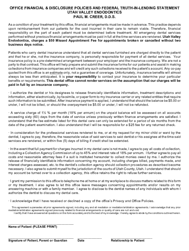 OFFICE FINANCIAL & DISCLOSURE POLICIES AND FEDERAL TRUTHINLENDING STATEMENT UTAH VALLEY ENDODONTICS PAUL M. CAREER, D.D.S. As a condition of your treatment by this office, financial arrangements must