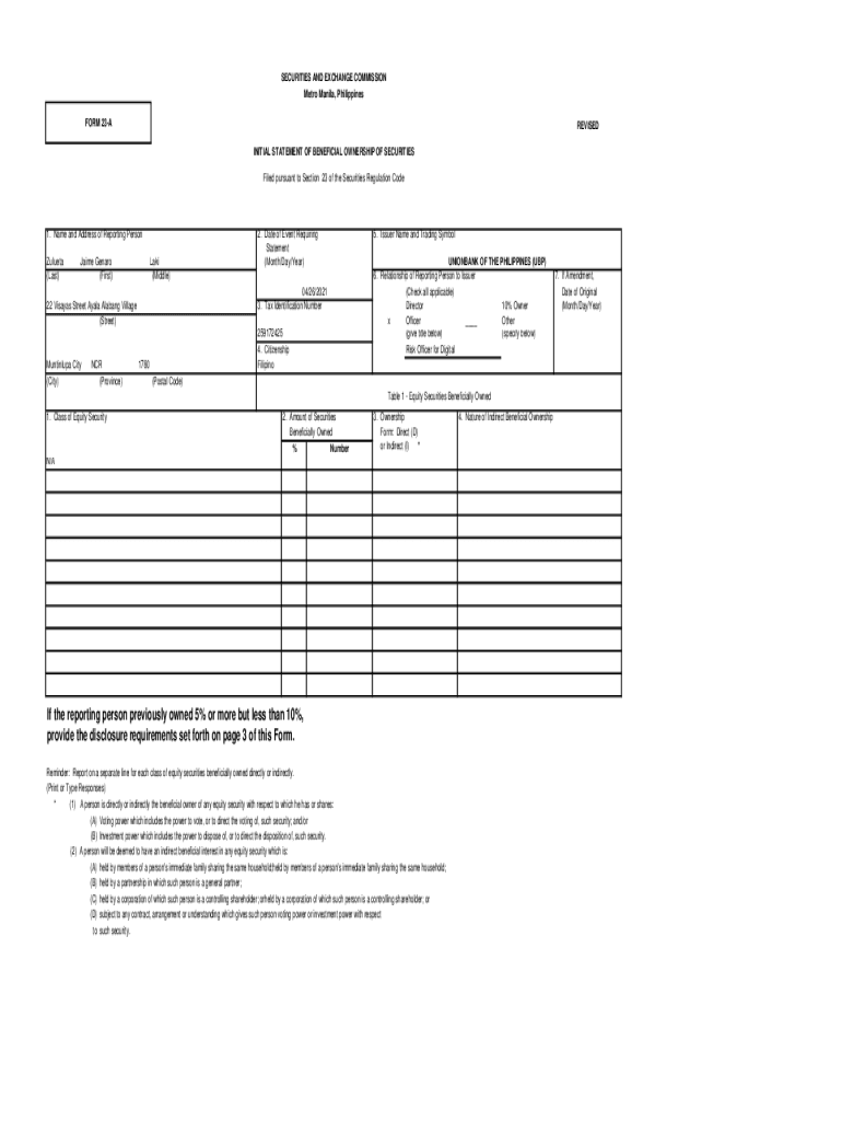 SECURITIES AND EXCHANGE COMMISSION Metro Manila, Philippines FORM 23AREVISED INITIAL STATEMENT OF BENEFICIAL OWNERSHIP OF SECURITIES Filed pursuant to Section 23 of the Securities Regulation Code1.