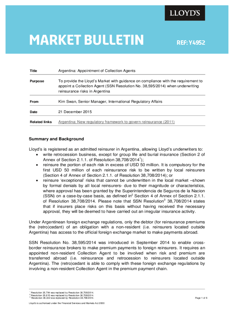 Market bulletined: Y4952TitleArgentina: Appointment of Collection AgentsPurposeTo provide the Lloyd's Market with guidance on compliance with the requirement to appoint a Collection Agent (SSN Resolution
