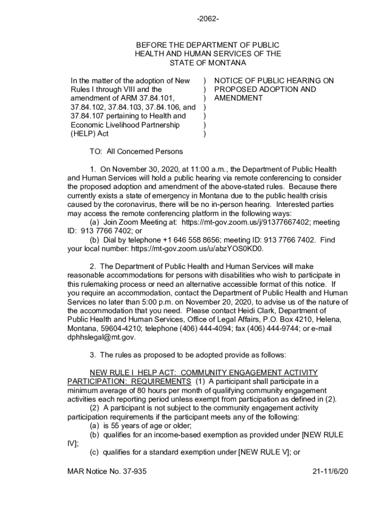 2062BEFORE THE DEPARTMENT OF PUBLIC HEALTH AND HUMAN SERVICES OF THE STATE OF MONTANA In the matter of the adoption of New Rules I through VIII and the amendment of ARM 37.84.101, 37.84.102, 37.84.103,