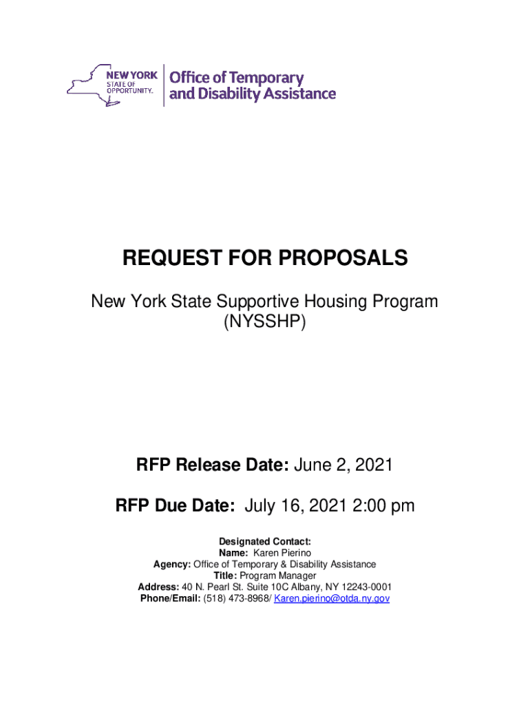REQUEST FOR PROPOSALS New York State Supportive Housing Program (HYSSOP)RFP Release Date: June 2, 2021, RFP Due Date: July 16, 2021 2:00 pm Designated Contact: Name: Karen Pairing Agency: Office of