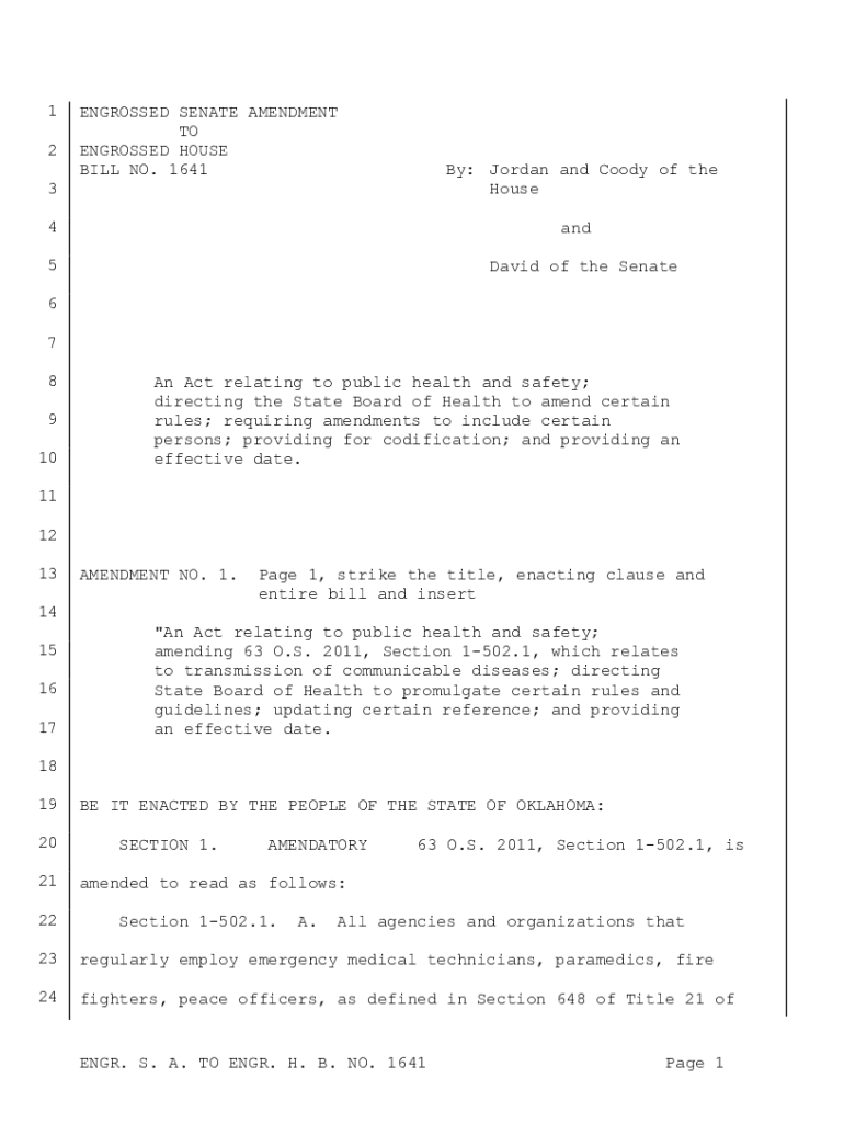 1 2ENGROSSED SENATE AMENDMENT TO ENGROSSED HOUSE BILL NO. 1641By: Jordan and Moody of the House3 4and5David of the Senate6 7 8 9 10An Act relating to public health and safety; directing the State