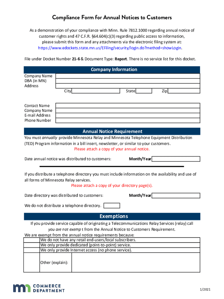 Compliance Form for Annual Notices to Customers As a demonstration of your compliance with Minn. Rule 7812.1000 regarding annual notice of customer rights and 47 C.F.R. 64.604(c)(3) regarding public