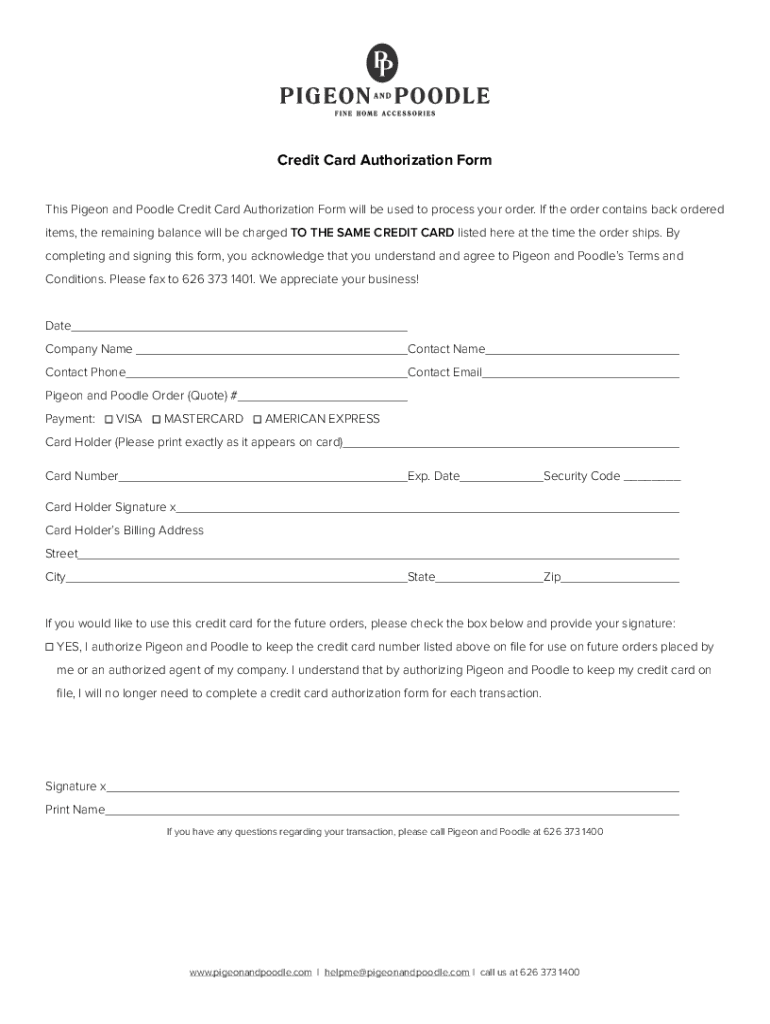 Credit Card Authorization Form This Pigeon and Poodle Credit Card Authorization Form will be used to process your order. If the order contains back ordered items, the remaining balance will be charged