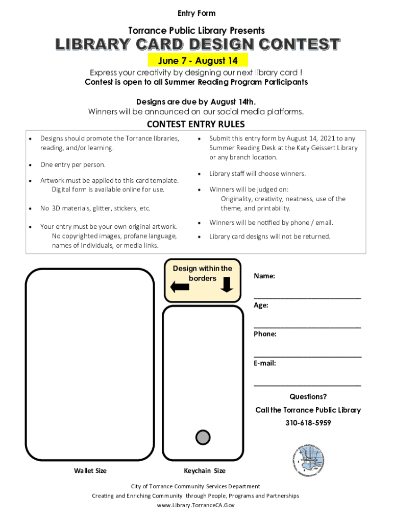 Entry Form Torrance Public Library Presents June 7 August 14 Express your creativity by designing our next library card ! Contest is open to all Summer Reading Program Participants Designs are due
