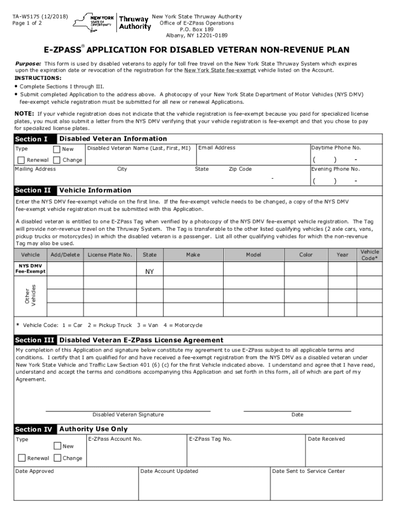 TAW5175 (12/2018) Page 1 of 2New York State Thruway Authority Office of Pass Operations P.O. Box 189 Albany, NY 122010189Clear FormEZPASS APPLICATION FOR DISABLED VETERAN REVENUE PLAN Purpose: This
