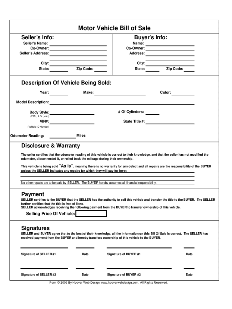 Motor Vehicle Bill of Sale Seller's Info:Buyer's Info:Seller's Name: Corner: Seller's Address:Name: Corner: Address:City: State:City: State:Zip Code:Zip Code:Description Of Vehicle Being Sold: Year:Make:Color:Model