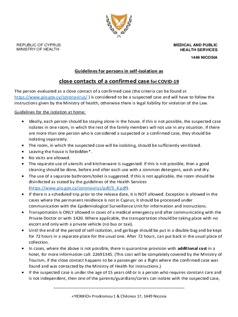 REPUBLIC OF CYPRUS MINISTRY OF HEALTHMEDICAL AND PUBLIC HEALTH SERVICES 1449 NICOSIAGuidelines for persons in self-isolation as close contacts of a confirmed case for COVID-19 The person evaluated
