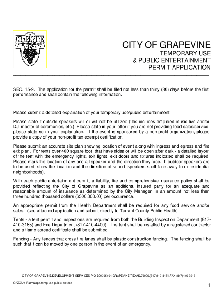 CITY OF GRAPEVINE TEMPORARY USE & PUBLIC ENTERTAINMENT PERMIT APPLICATION SEC. 159. The application for the permit shall be filed not less than thirty (30) days before the first performance and shall
