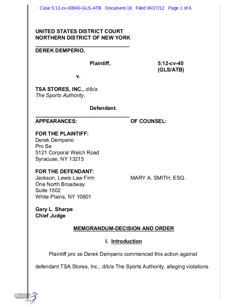 Case 5:12cv00040GLSATB Document 18 Filed 04/27/12-Page 1 of 6UNITED STATES DISTRICT COURT NORTHERN DISTRICT OF NEW YORK DEREK DEMERIT, Plaintiff,5:12cv40 (GLS/ATB)v. TSA STORES, INC., d/b/a Sports