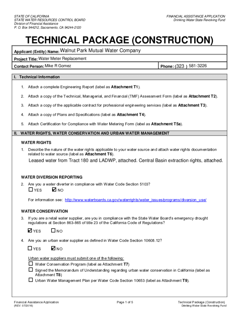 STATE OF CALIFORNIA STATE WATER RESOURCES CONTROL BOARD Division of Financial Assistance P. O. Box 944212, Sacramento, CA 942442120FINANCIAL ASSISTANCE APPLICATION Drinking Water State Revolving Nontechnical