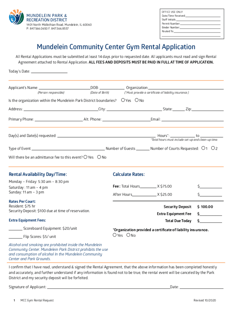OFFICE USE ONLY Date/Time Received:Staff Initials:Permit Number:Binder Number:Routed To:MUNDELEIN PARK & RECREATION DISTRICT1401 North Midlothian Road, Mundelein, IL 60060 P: 847.566.0650 F. 847.566.8557Mundelein