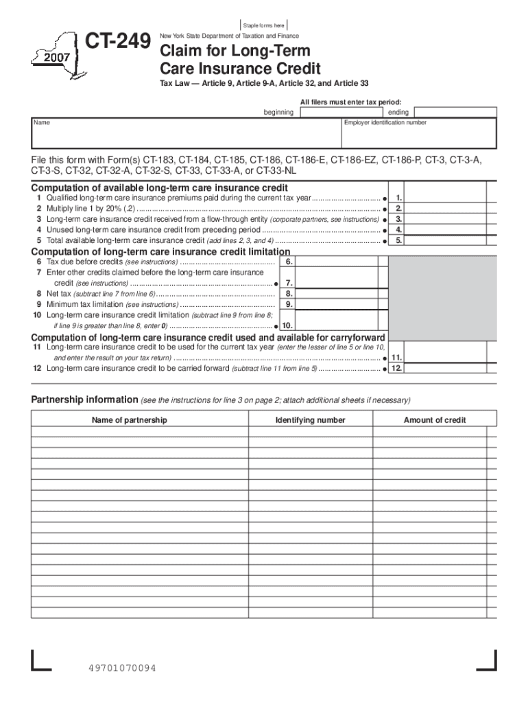 Staple forms hereCT249New York State Department of Taxation and FinanceClaim for Longer Care Insurance Credit Tax Law Article 9, Article 9A, Article 32, and Article 33beginningNameAll filers must