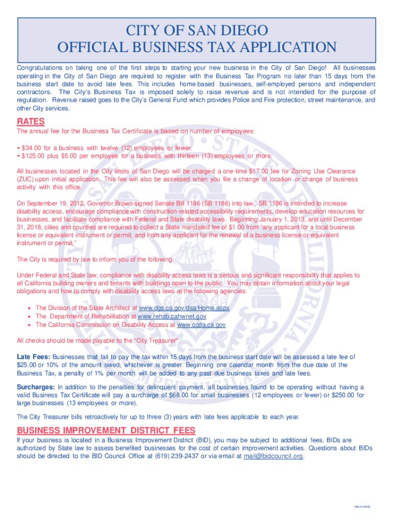 CITY OF SAN DIEGO OFFICIAL BUSINESS TAX APPLICATION Congratulations on taking one of the first steps to starting your new business in the City of San Diego! All businesses operating in the City of