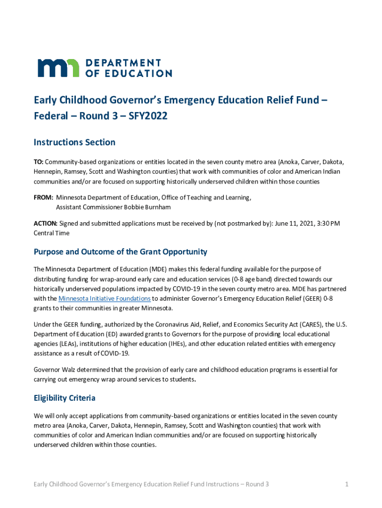 Early Childhood Governors Emergency Education Relief Fund Federal Round 3 SFY2022 Instructions Section TO: Community based organizations or entities located in the seven county metro area (ANOVA,