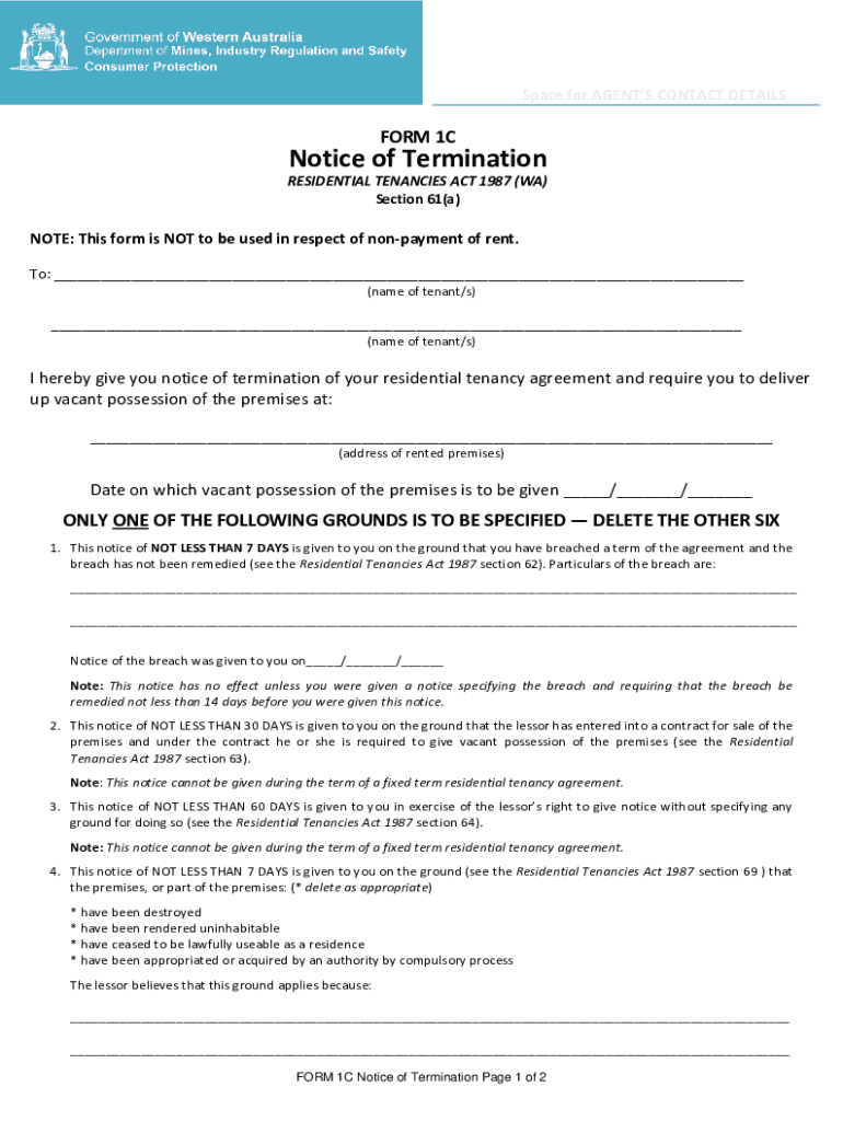 Space for AGENTS CONTACT DETAILSFORM 1CNotice of TerminationRESIDENTIAL TENANCIES ACT 1987 (WA) Section 61(a)NOTE: This form is NOT to be used in respect of nonpayment of rent. To: (name of tenant/s)