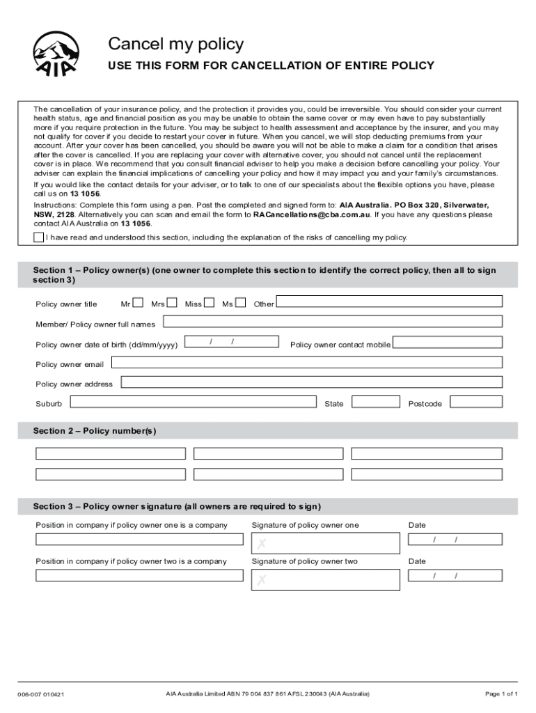 Cancel my policy USE THIS FORM FOR CANCELLATION OF ENTIRE Police cancellation of your insurance policy, and the protection it provides you, could be irreversible. You should consider your current