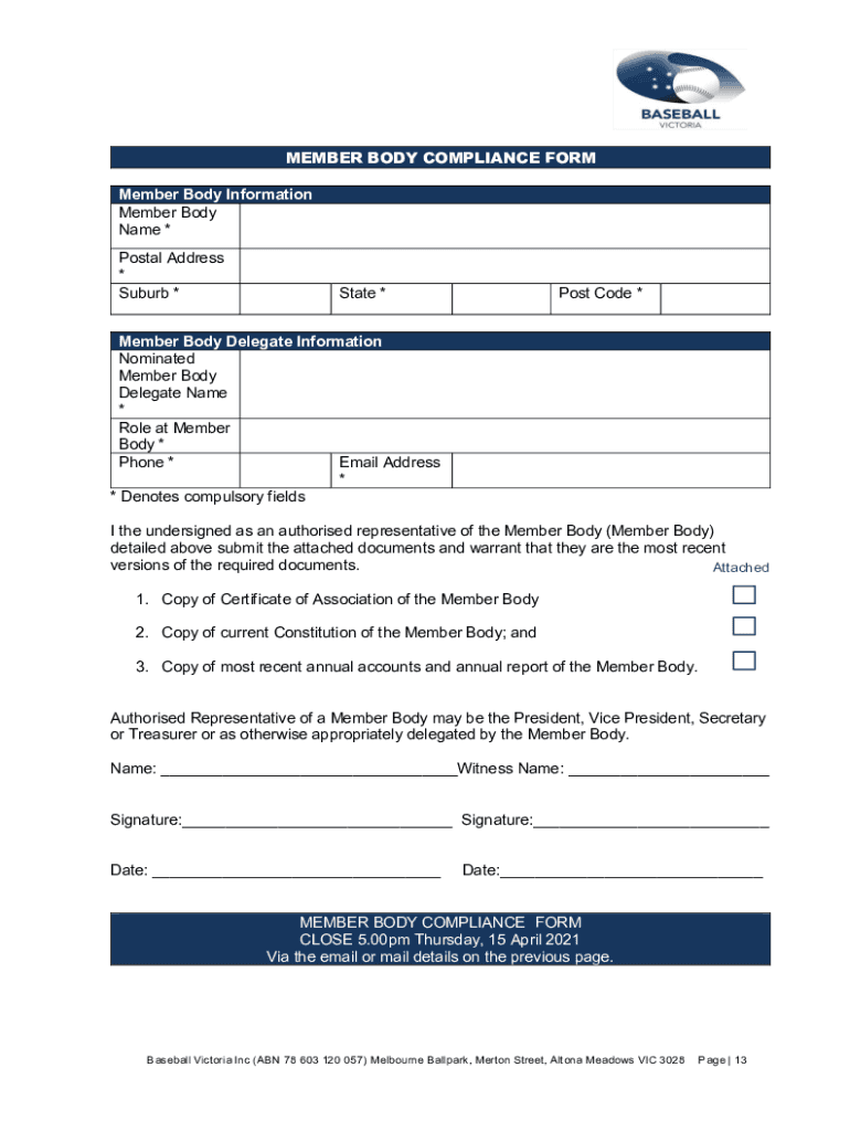 MEMBER BODY COMPLIANCE FORM Member Body Information Member Body Name * Postal Address * Suburb *State *Post Code *Member Body Delegate Information Nominated Member Body Delegate Name * Role at Member