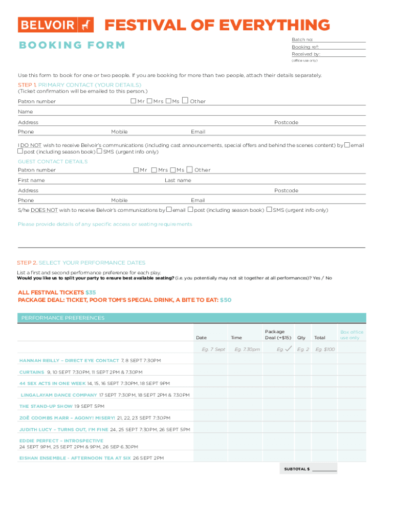 FESTIVAL OF EVERYTHING Batch no:BOOKING Foreboding ref: Received by: (office use only)Use this form to book for one or two people. If you are booking for more than two people, attach their details