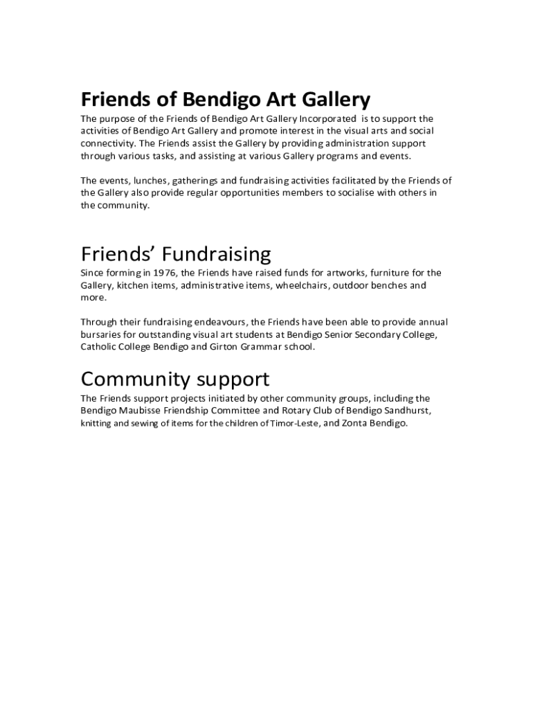 Friends of Bendigo Art Gallery The purpose of the Friends of Bendigo Art Gallery Incorporated is to support the activities of Bendigo Art Gallery and promote interest in the visual arts and social