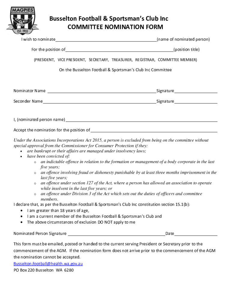 Busselton Football & Sportsman Club Inc COMMITTEE NOMINATION FORM I wish to nominate (name of nominated person) For the position of (position title) (PRESIDENT, VICE PRESIDENT, SECRETARY, TREASURER,