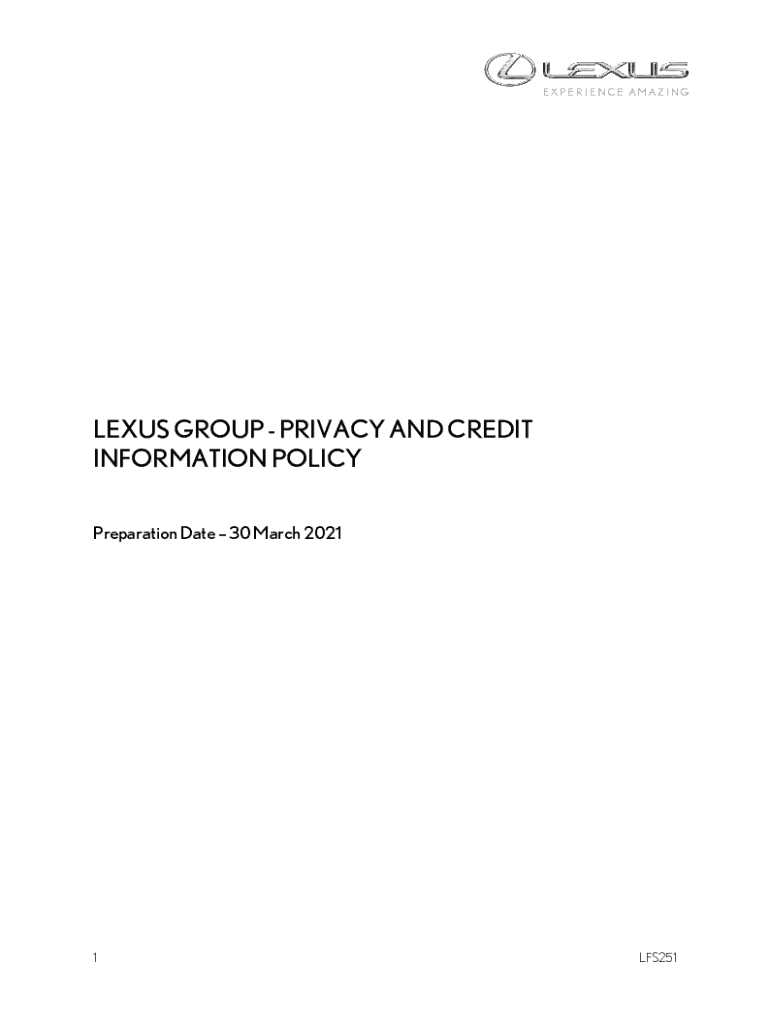 LEXUS GROUP PRIVACY AND CREDIT INFORMATION POLICY Preparation Date 30 March 20211LFS251Who, are we? In this policy the Lexus Group (or we or us) is: Lexus Australia a division of Toyota Motor Corporation