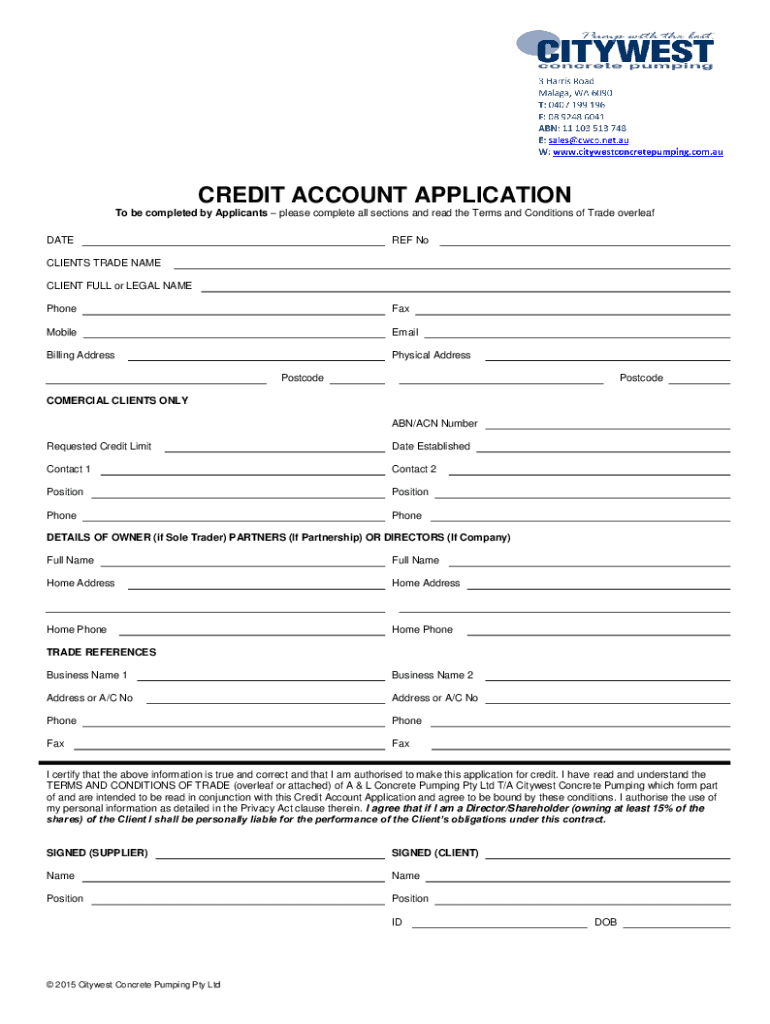 CREDIT ACCOUNT APPLICATION To be completed by Applicants please complete all sections and read the Terms and Conditions of Trade overleaf CATERED Clients TRADE NAME CLIENT FULL or LEGAL NAME PhoneFaxMobileEmailBilling