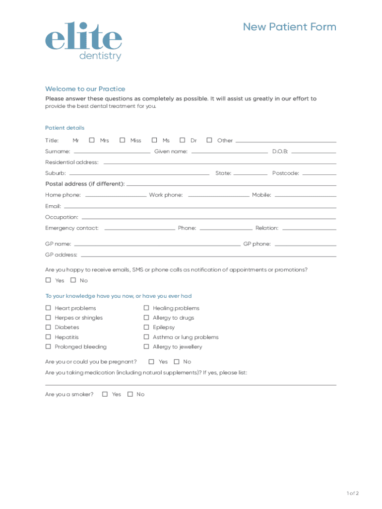 All new patients at Elite Dentistry in Neutral Bay are required to fill out this form.